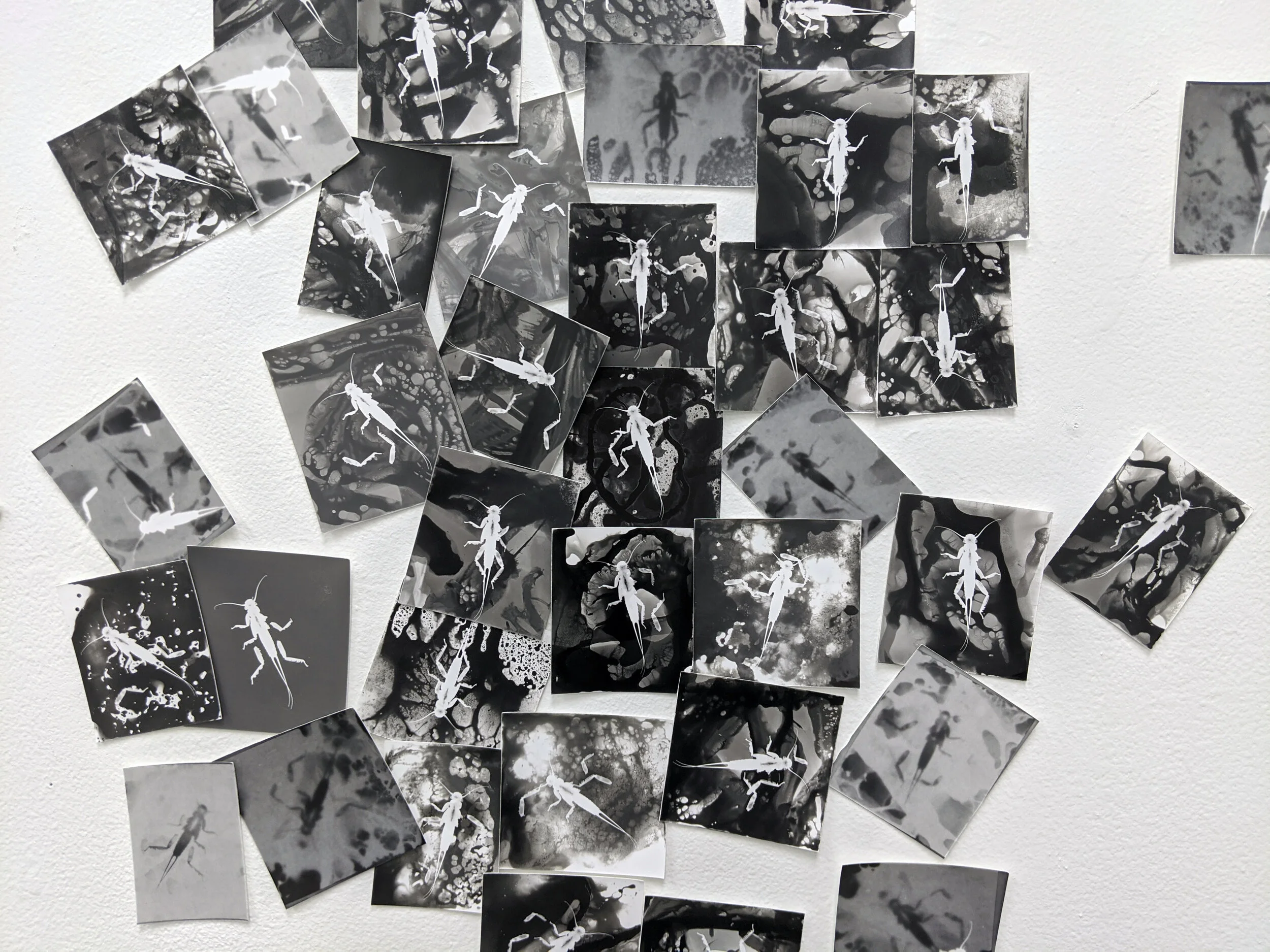 View fullsize Swarm, 2019, b&w photograms of a stonefly nymph, dimensions variable. View fullsize View fullsize
